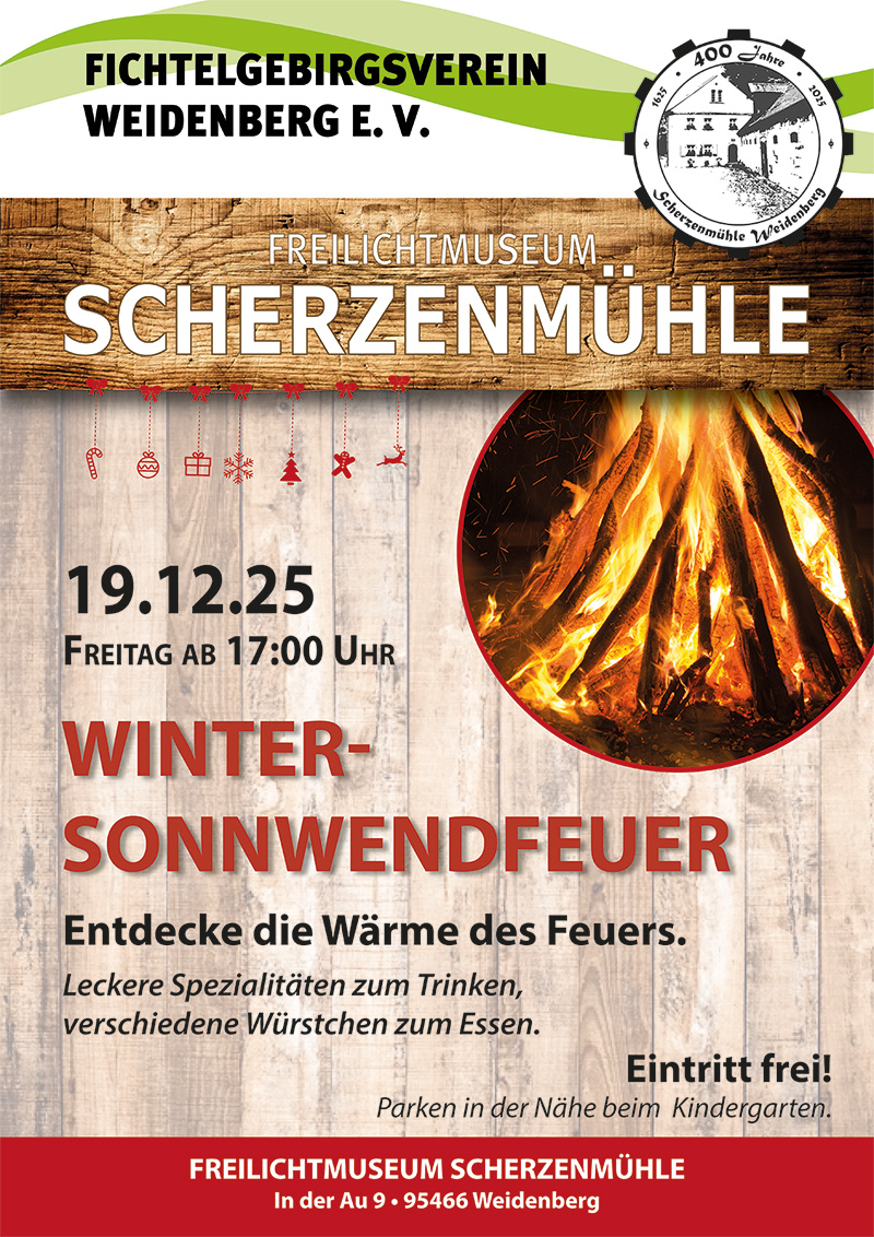 Freitag, 19. Dezember 2025 - 17:00 Veranstalter: FGV WeidenbergWo: Scherzenmühle, In der Au 9, 95466 Weidenberg https://www.fgv-weidenberg.de